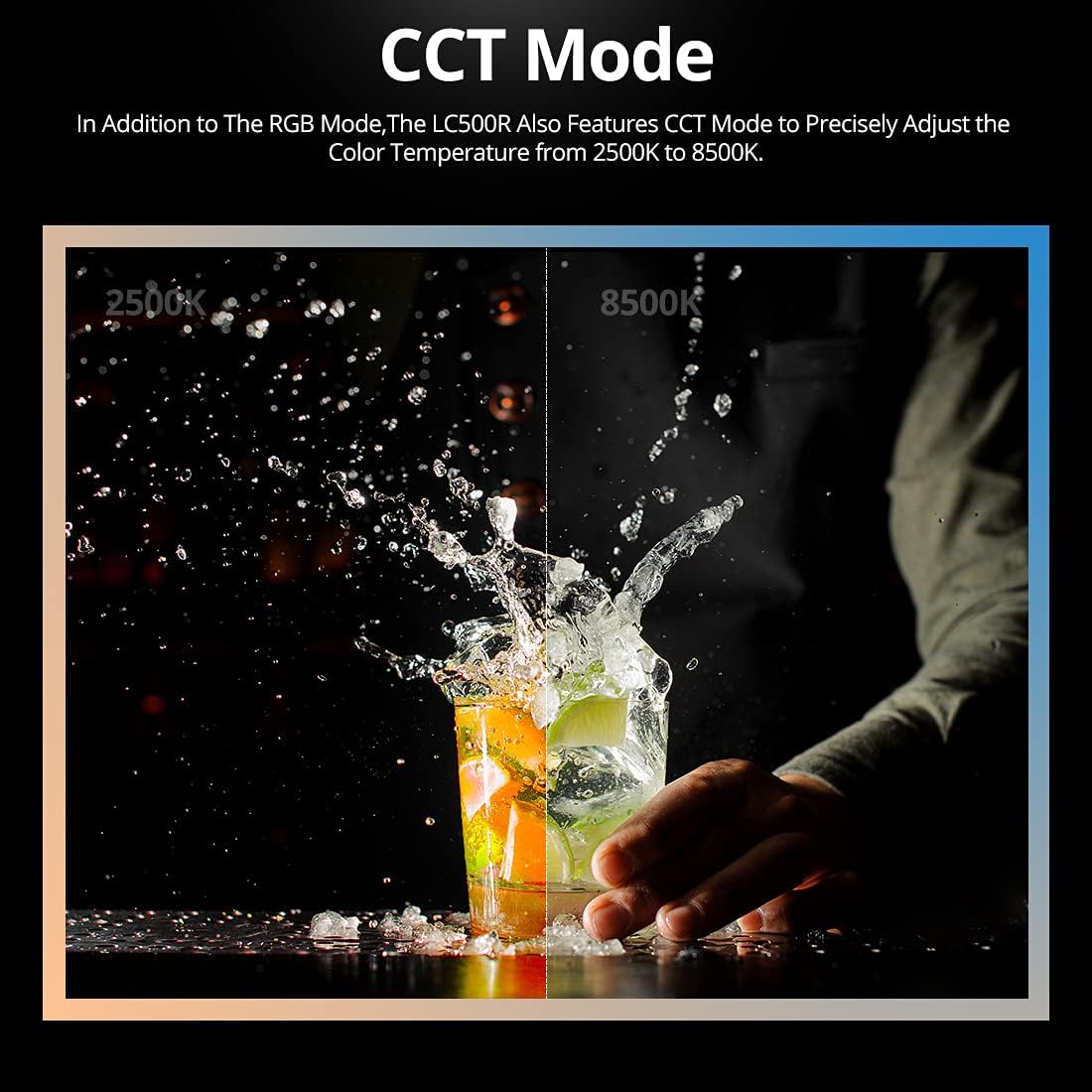 2500K-8500K Adjustable, Accurate Color Rendition :The LC500R features CCT mode to precisely adjust the color temperature from 2500k to 8500k. With the CRI rating at 96 and TLCI at 98, the light reproduces the nature and vibrant colors.