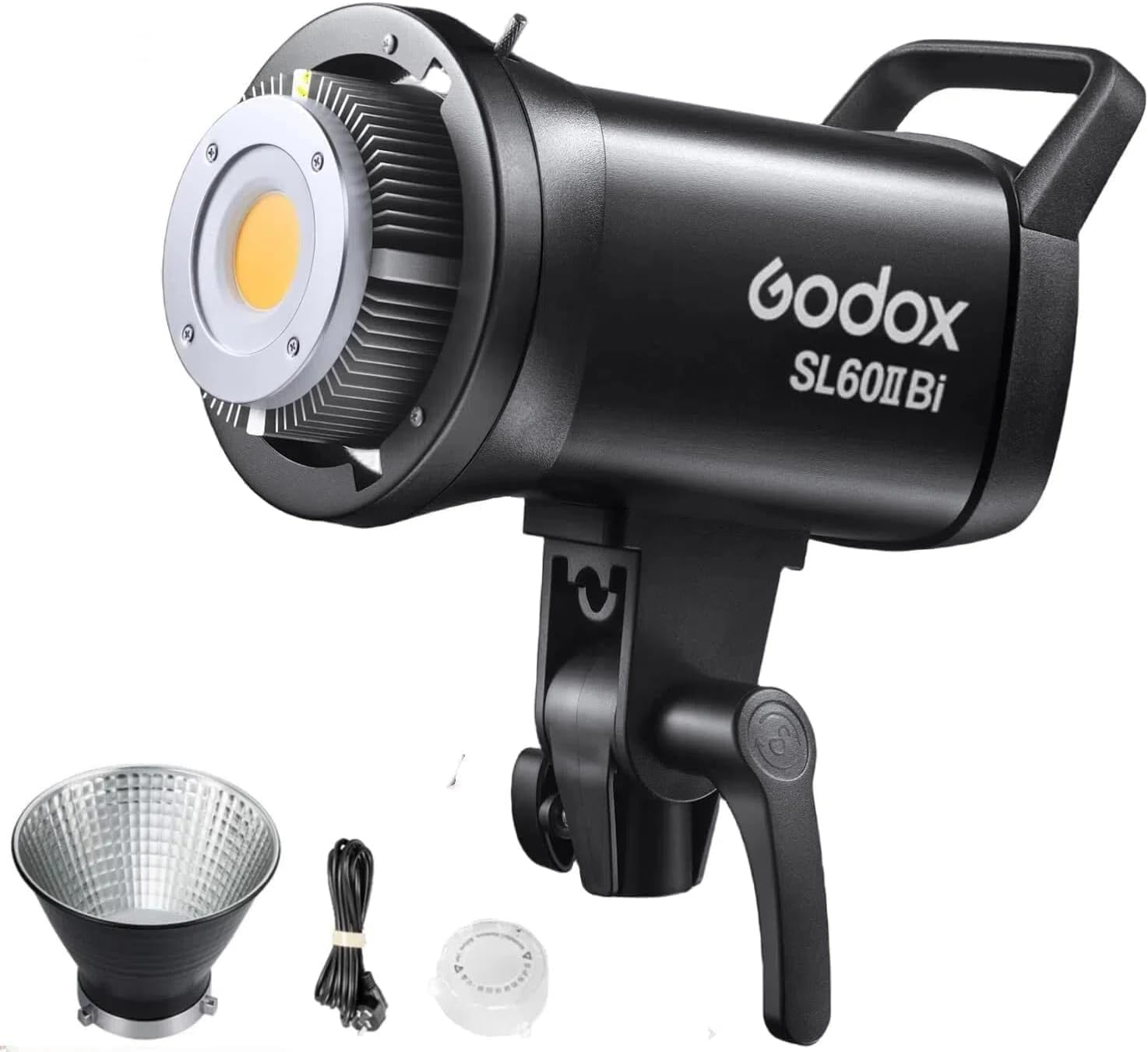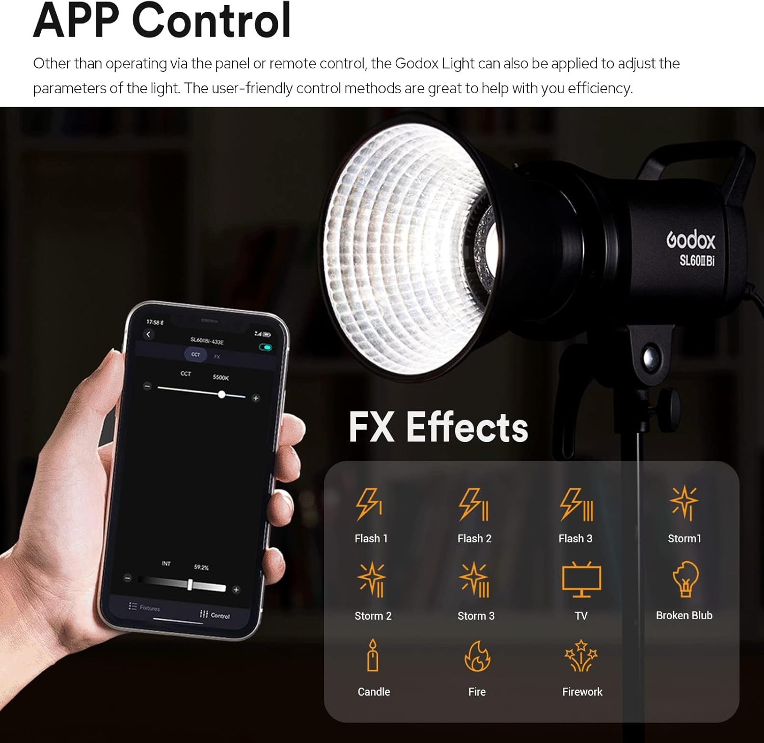 GODOX SL60W UPGRADE: Godox SL60IIBi is upgraded on the basis of Godox SL60W, add 11 new FX light effects, 3 more than SL60IID, higher power (75W), wider dimming range (0-100%), color temperature adjustable 2800k-6500k, improved CRI(96+) and TLCI(97+). And SL60IIBI can also connect to Bluetooth to use the “Godox Light” APP or RC-A6 remote(Include) to control the light.
