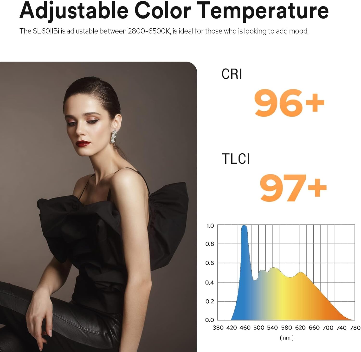 COMPACT BODY&POWERFUL LIGHT: 3.2lb, 9.3*8.5*5.5 inch, the compact studio led light has a monster output, SL60IIBi has a brightness of 25,100 lumens at 1 meter-5600K, producing impressive brightness. Whether shooting YouTube videos or short commercials, you can get what you want from the SL60IIBI bicolor led light.