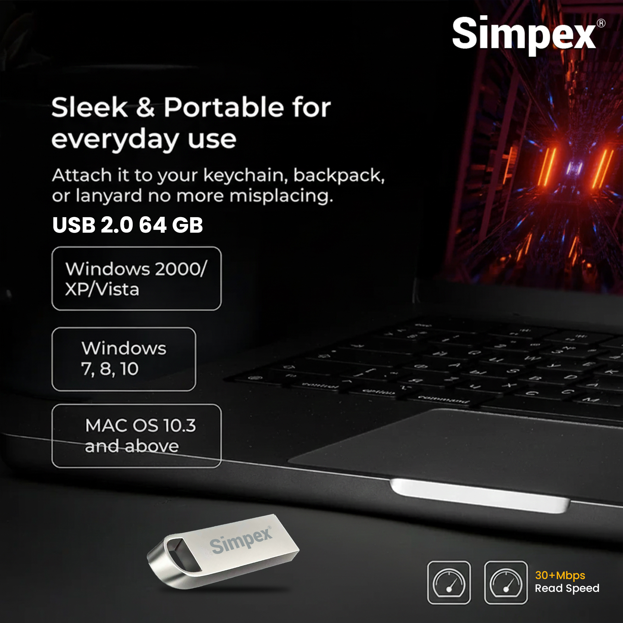 Versatile Compatibility: Simpex pendrive is incredibly versatile, such as Windows 2000 / XP and Vista, Windows 7, 8, 10 and operating systems 10.3 and above.