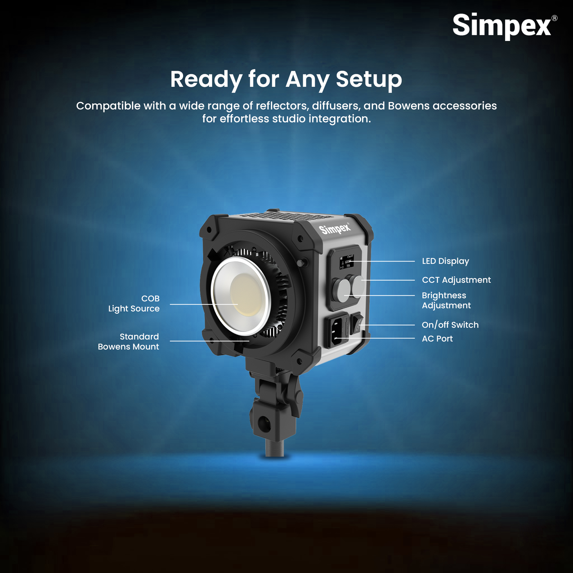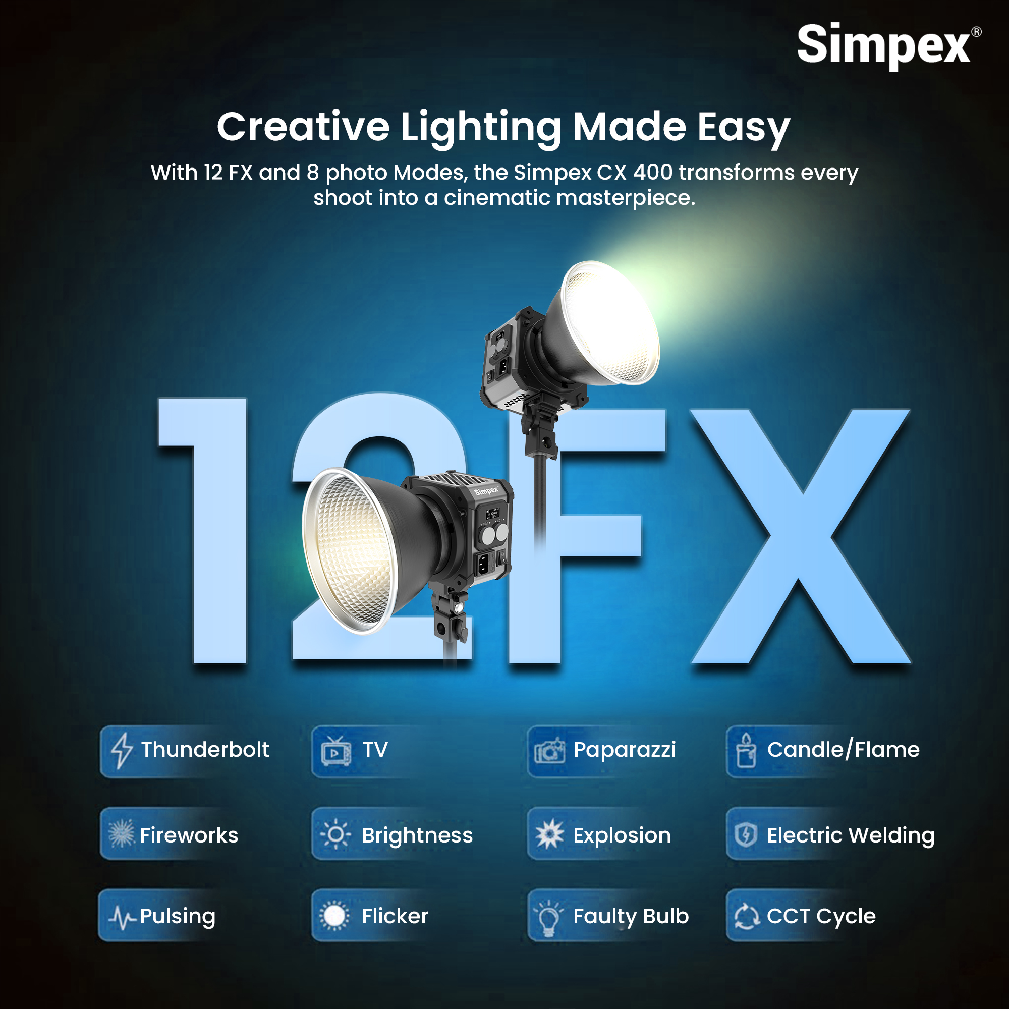 • Ultra-Bright 400W COB LED for Professional Shoots: The Simpex CX-400Bi is ideal for product photography, commercial shoots, YouTube videos, filmmaking, and live streaming due to its powerful 400W COB LED output of 18,750 lumens. Enjoy steady, flicker-free light in each frame.