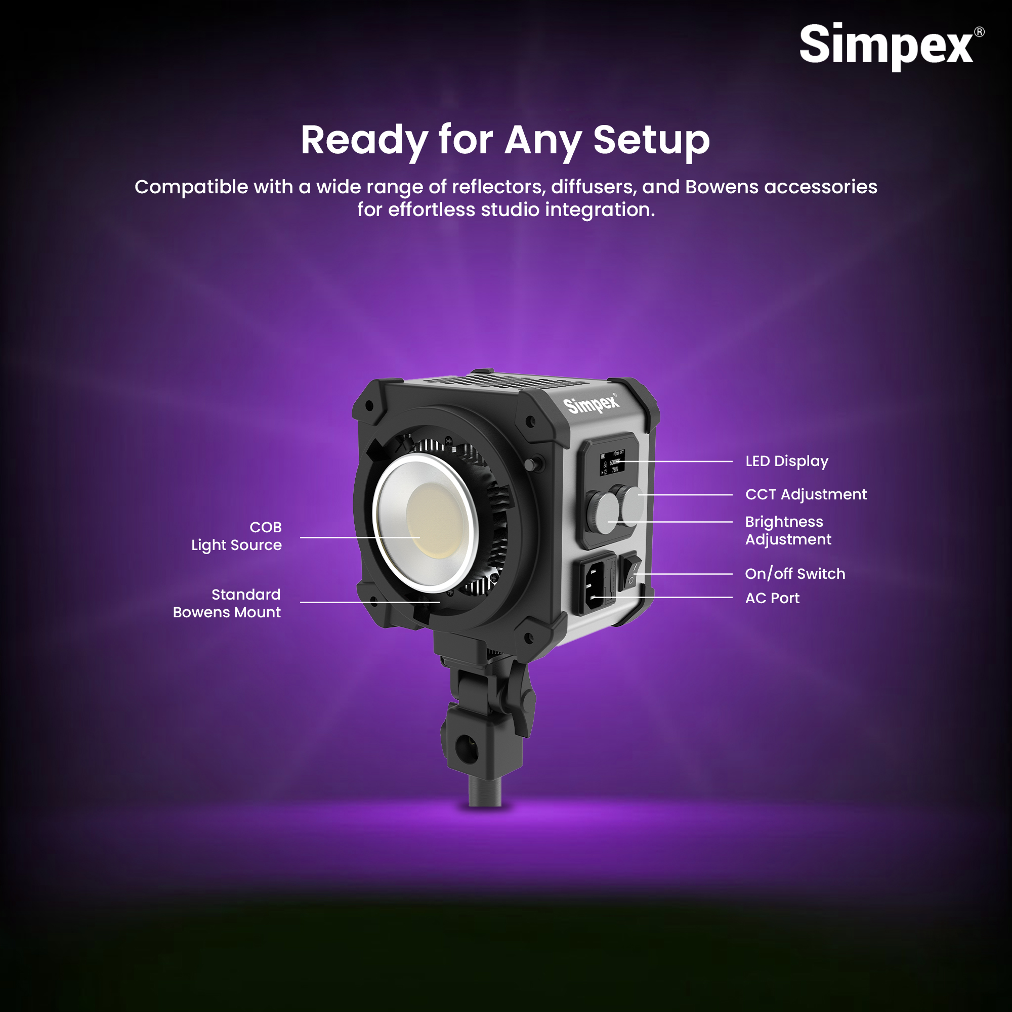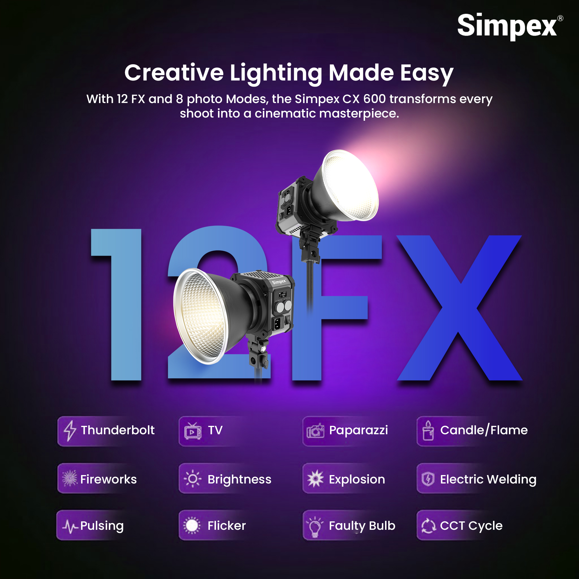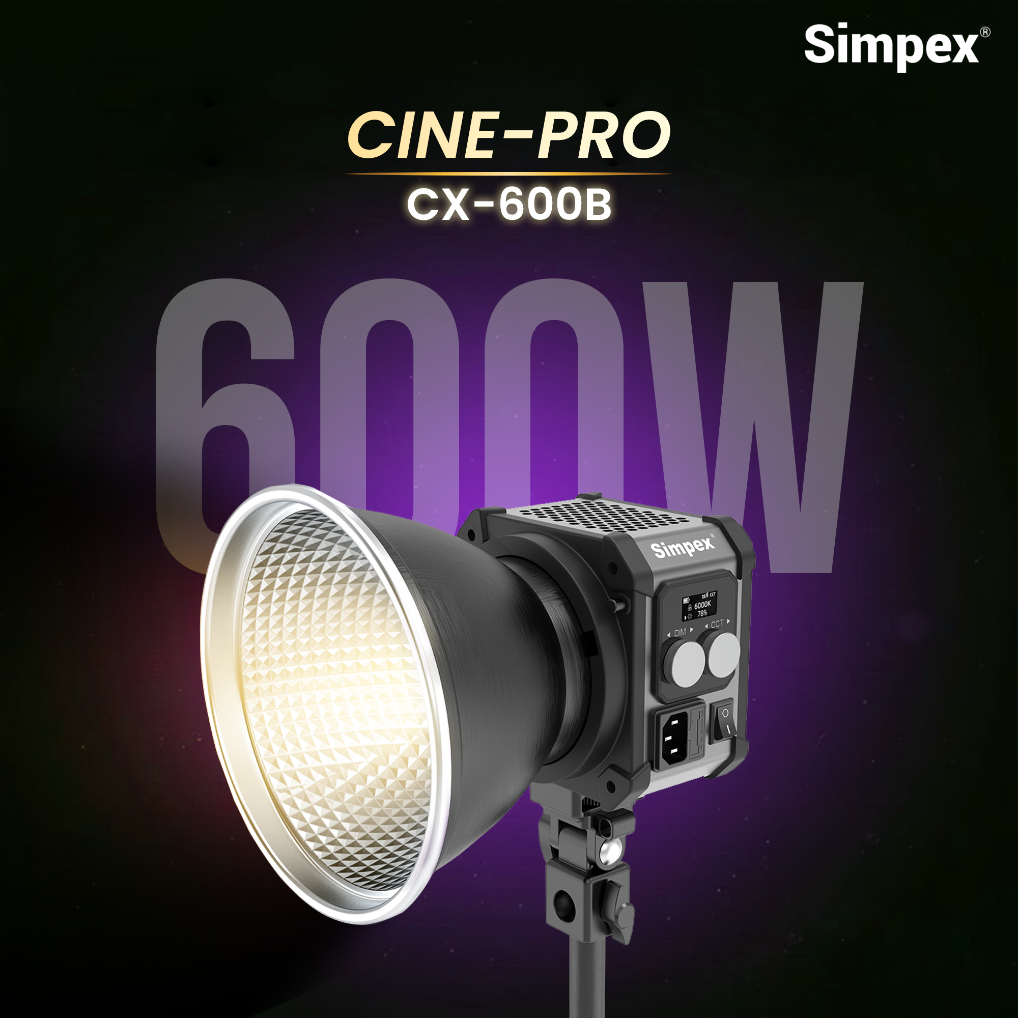 Ultra-Bright 600W COB LED for Professional Shoots: The Simpex CX-600Bi is ideal for product photography, commercial shoots, YouTube videos, filmmaking, and live streaming due to its powerful 600W COB LED output of 18,750 lumens. Enjoy steady, flicker-free light in each frame.