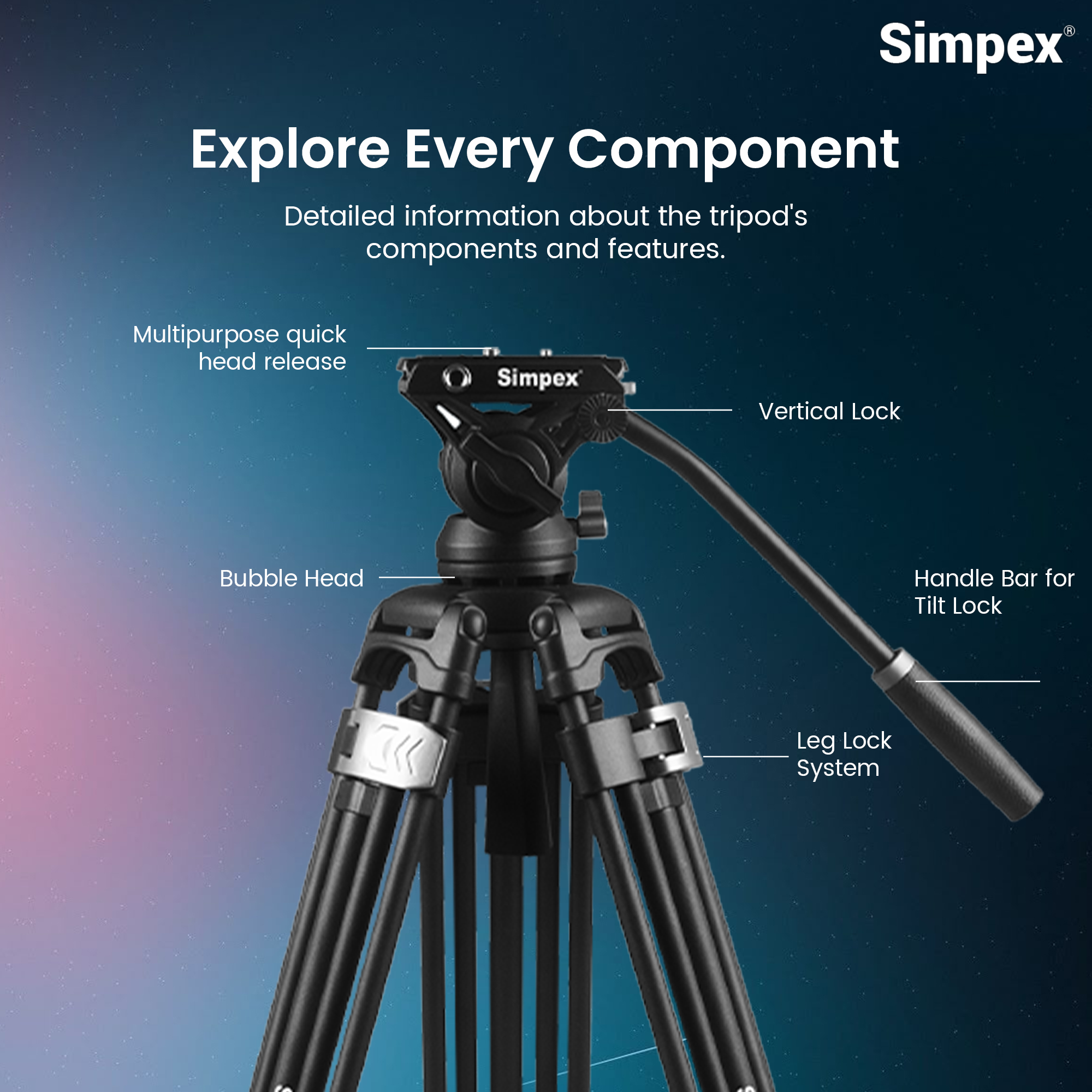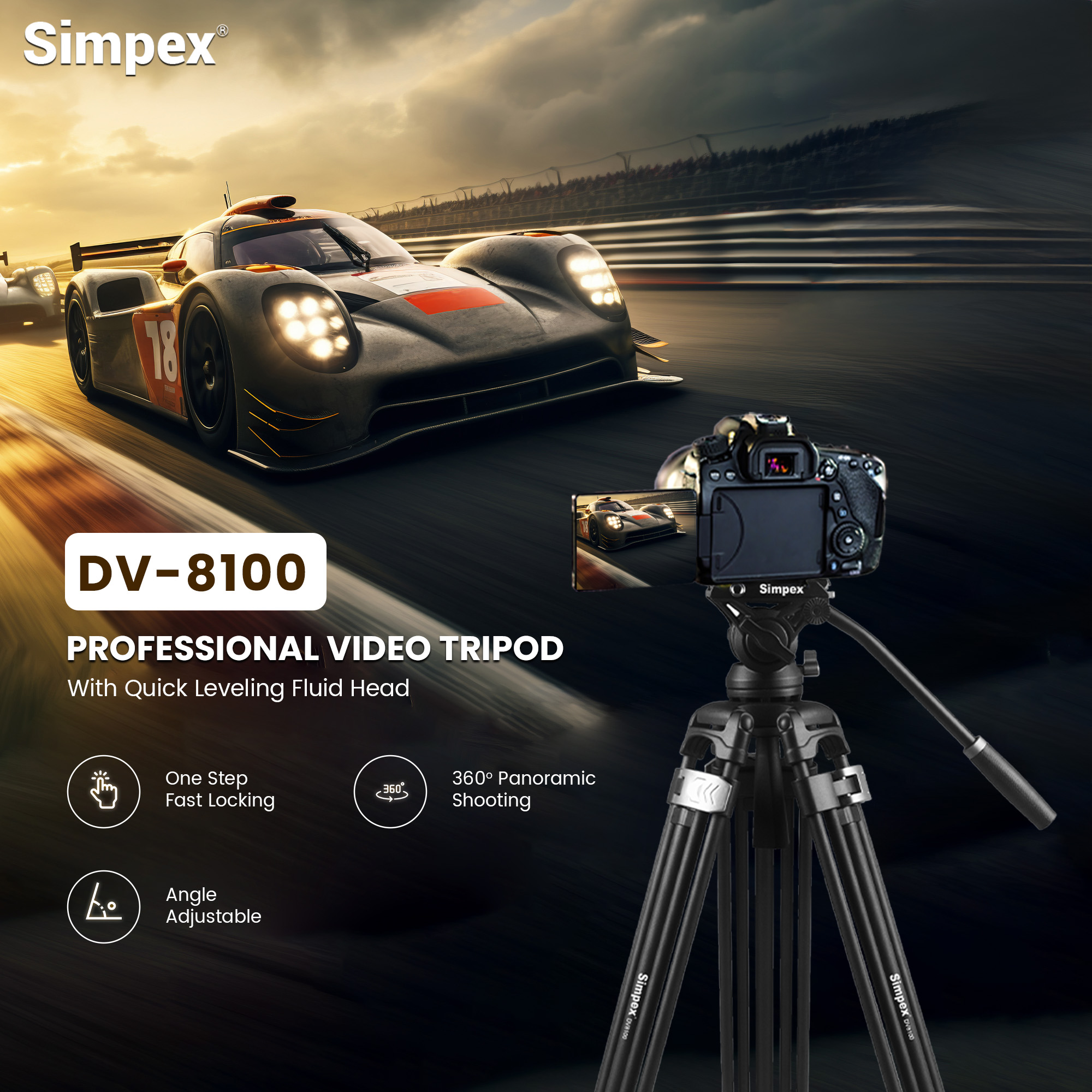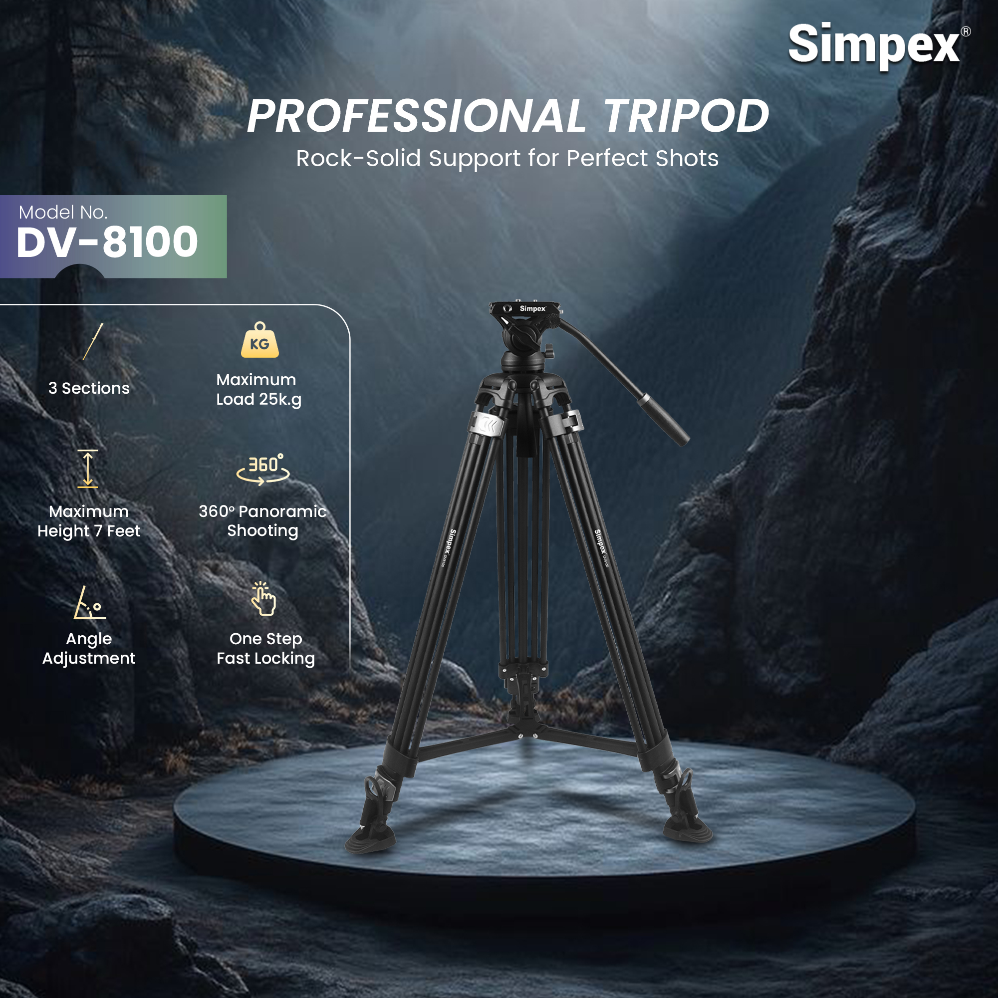 The Simpex DV 8100, a sturdy, professional-grade tripod system made for filmmakers who require stability without sacrificing quality, will improve your cinematography.