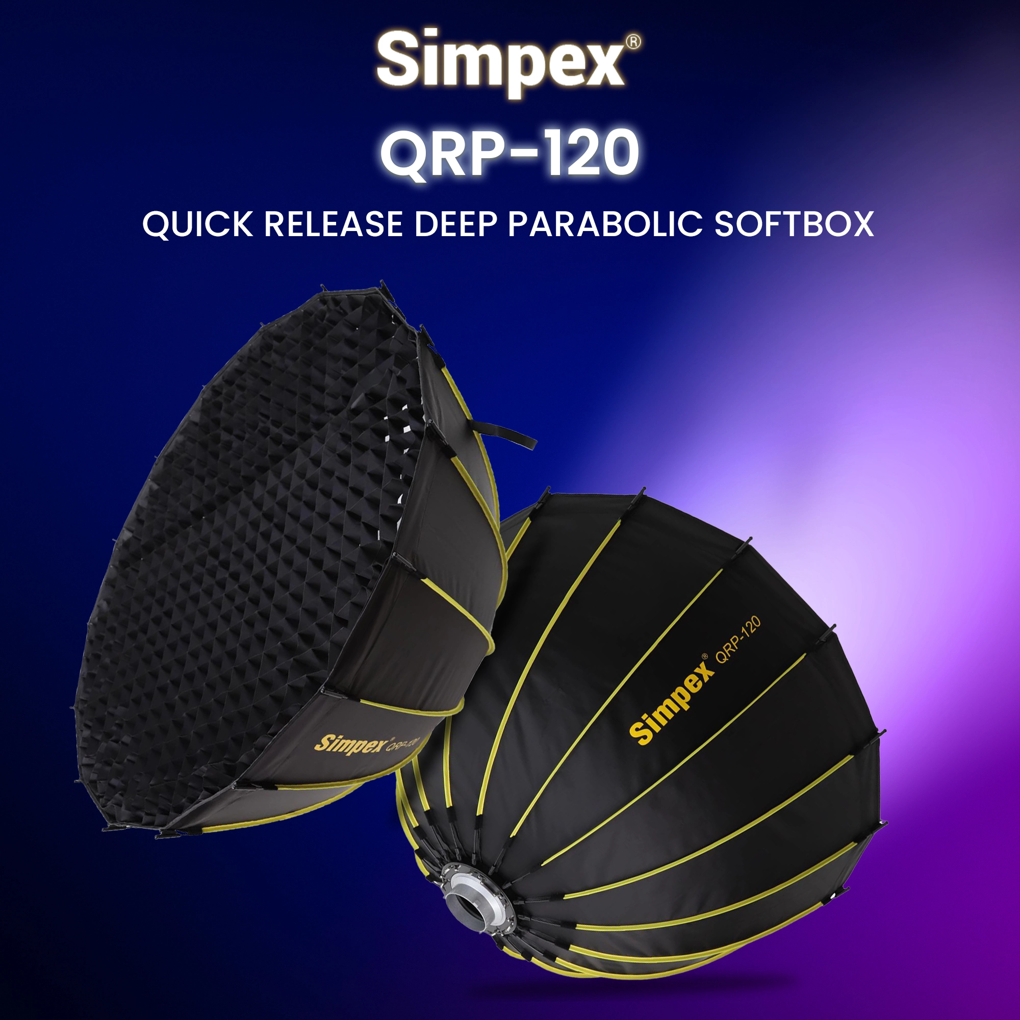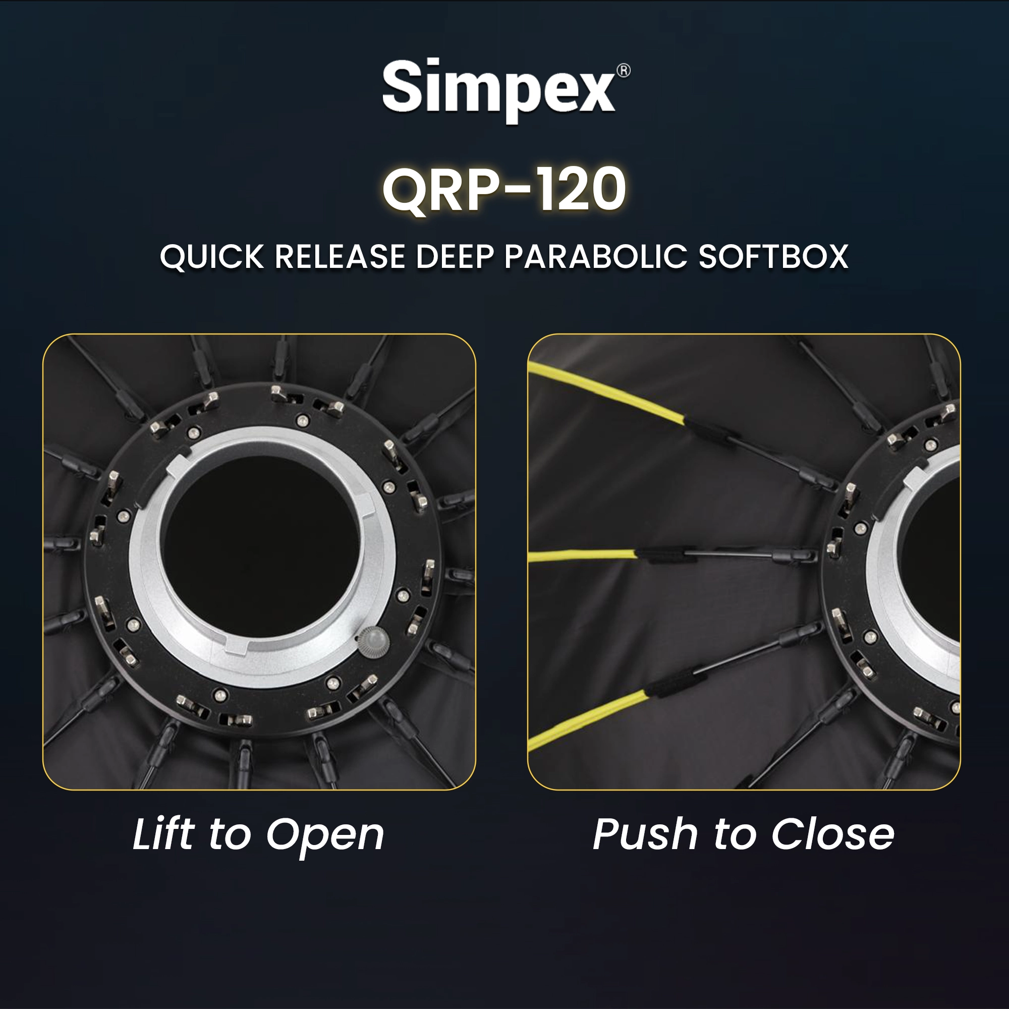 Easy Setup: The Simpex QRP-120 Quick Release Deep Parabolic Soft box come with Simpex unique rapid-latch speed ring, making setup quick and easy. With just a pull-and-press motion, the speed ring locks firmly in place. The last step is to attach the diffusion fabric with hook and loop fasteners.