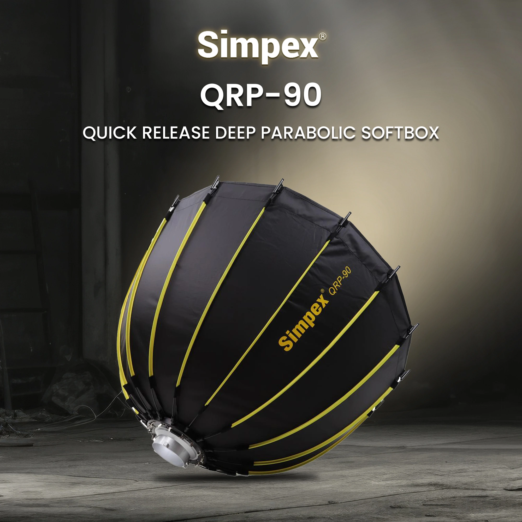 Easy Setup: The Simpex QRP-90 Quick Release Deep Parabolic Softbox come with Simpex unique rapid-latch speed ring, making setup quick and easy. With just a pull-and-press motion, the speed ring locks firmly in place. The last step is to attach the diffusion fabric with hook and loop fasteners.