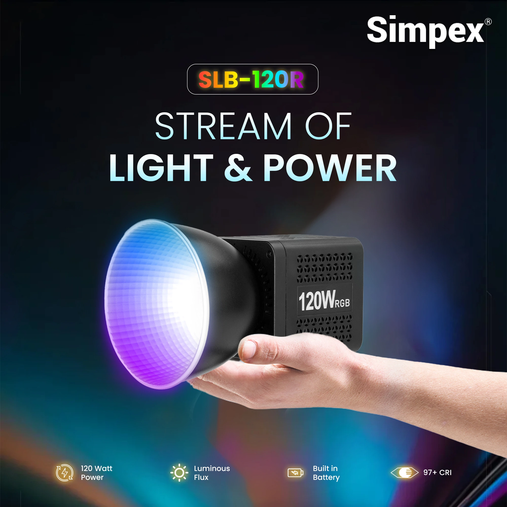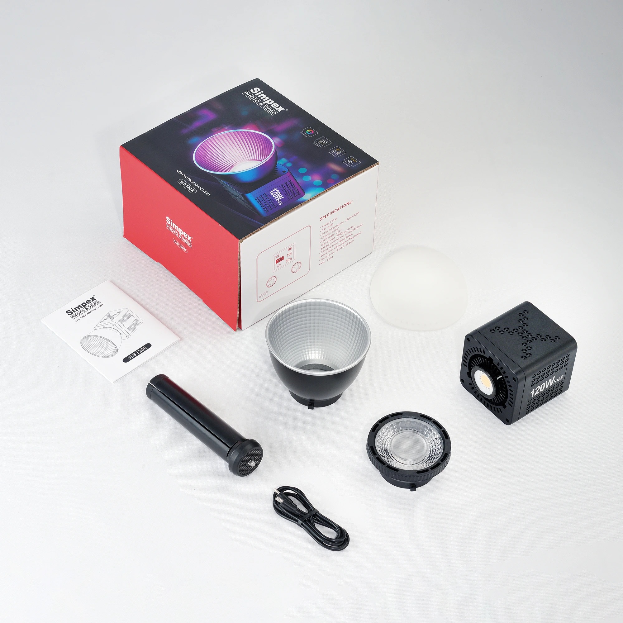 Compact & Powerful: Simpex SLB 120R features COB LEDs with up to 120W output. It offers adjustable color temperature (2700K-6500K) and brightness (0-100%). The RGB mode allows hue (0-360°) and saturation (0-100%) adjustments. With 20 built-in light effects, you can quickly create various atmospheres, enhancing creativity and artistry.