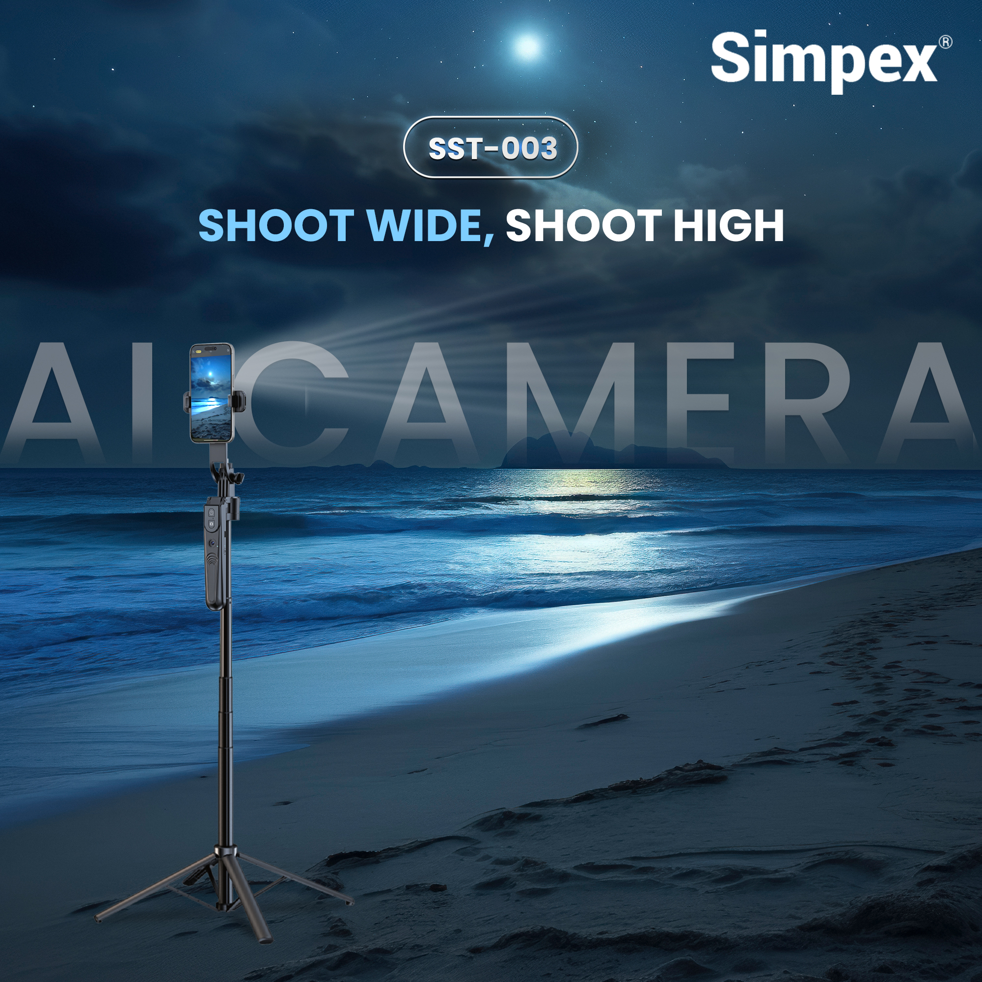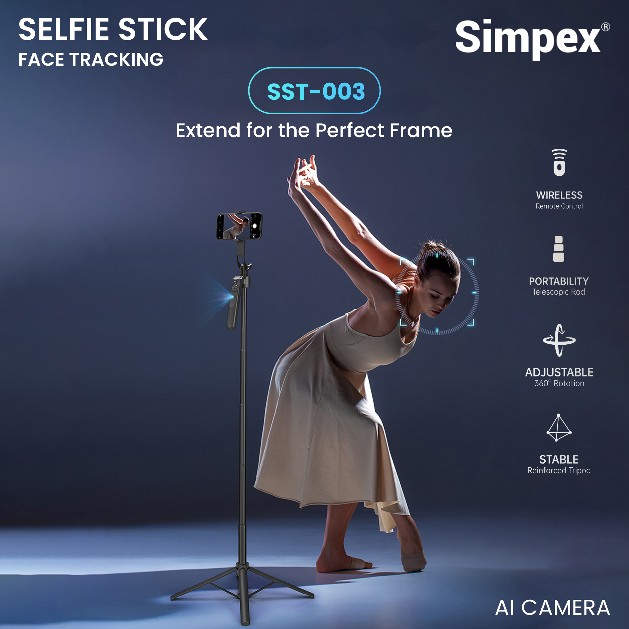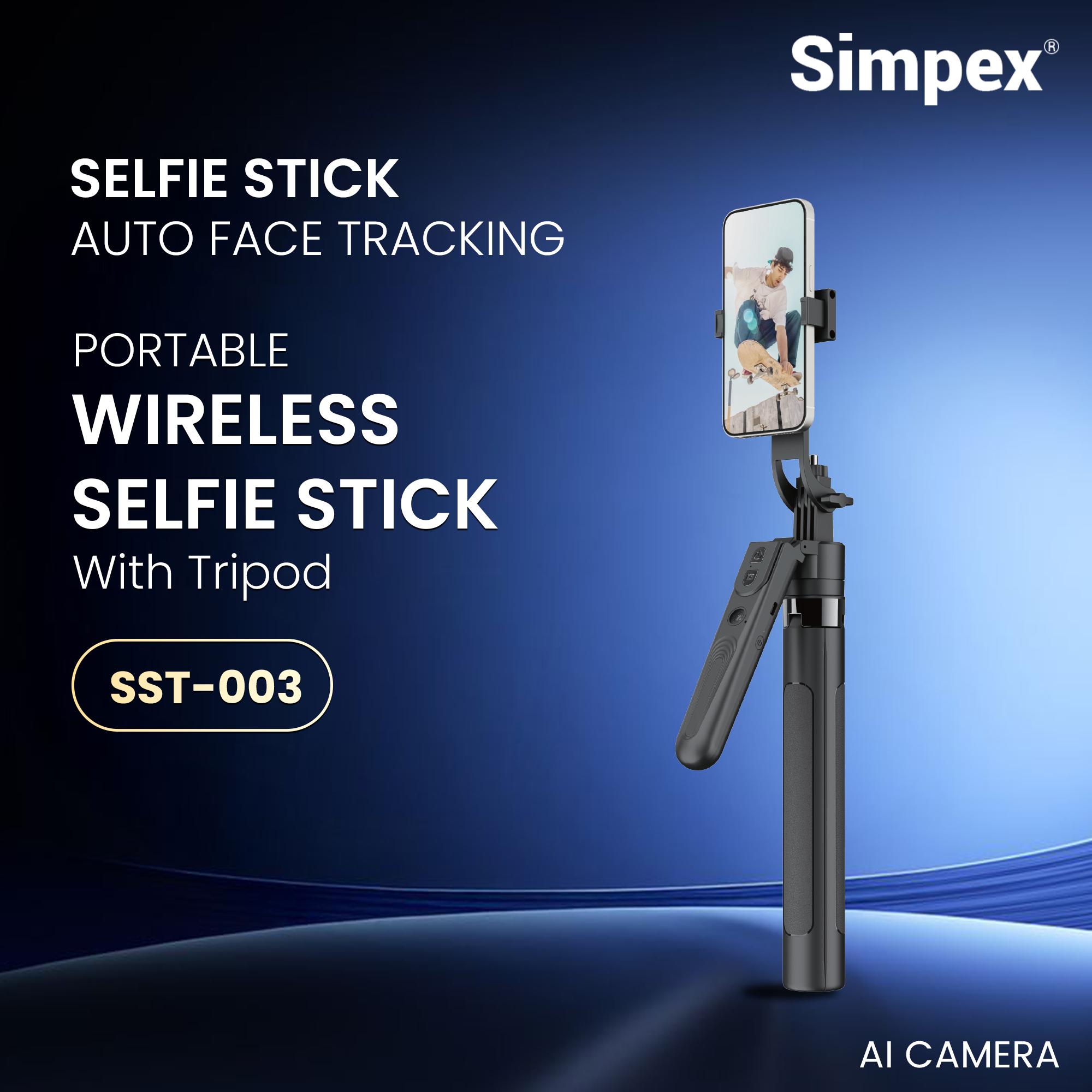 Simpex SST-003 selfie stick has AI-powered auto face tracking technology, so you can take amazing wide-angle shots, group photos, and unique angles. It can be extended up to 64 inches (163 cm) and is great for vlogging and selfies. It works with both iPhone and Android selfie sticks.