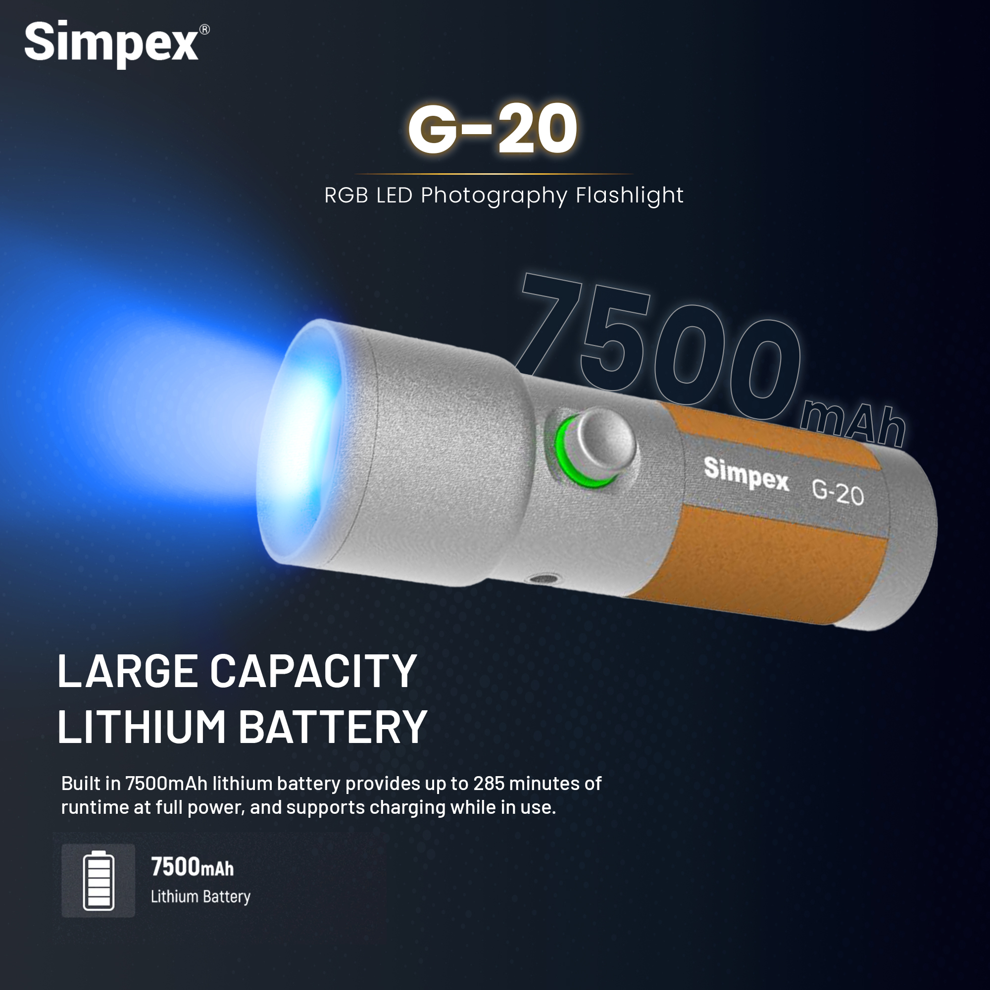 Long-Lasting 7500mAh Battery: The Simpex G-20 Flash’s robust built-in 7500mAh battery provides up to 350 minutes of continuous use at maximum brightness, making it perfect for prolonged shoots.